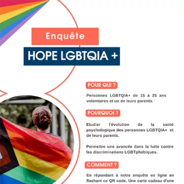 Projet de recherche HOPE LGBTQIA + financé par l’Agence Nationale de la Recherche et dont l’objectif est d’étudier les facteurs impliqués dans la santé des jeunes personnes LGBTQIA + et de leurs parents. Nous espérons que les résultats de cette recherche permettront une avancée dans la lutte contre les discriminations LGBTphobiques.