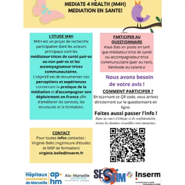 MEDIATE 4 HEALTH (M4H) souhaite recueillir l’avis des médiateur-rices en santé sur leurs missions, perceptions, en vue d’améliorer leurs conditions d’exercice et de légitimer leurs professions.